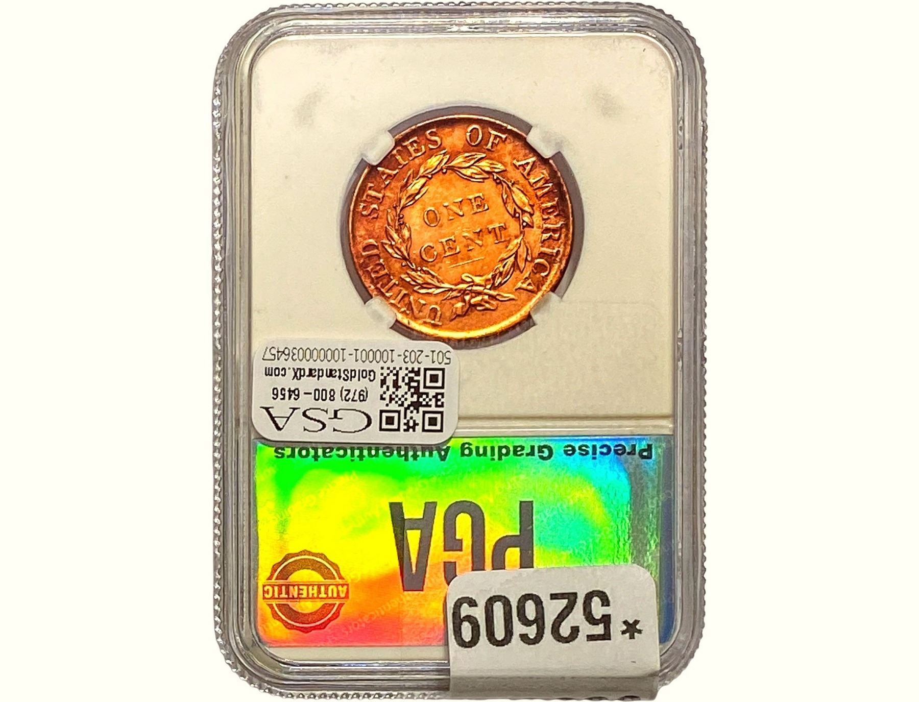 l. All non-certified coins and currency are guaranteed genuine, but are not guaranteed as to grade, since grading is a matter of opinion, an art and not a science, and therefore the description rendered by GSA or any third-party grading service may not agree with the opinion of others (including trained experts), and the same expert may not grade the same item with the same grade at two different times. GSA may, but is not obligated to, express an opinion as to non-certified numismatic items, in GSA’s opinion, or by its employees’ experience and the current interpretation of the American Numismatic Association’s standards as of the date the catalog was prepared. There is no guarantee or warranty expressed or implied that the grading opinions utilized by GSA, if any, will meet the standards of any grading service at any time in the future.