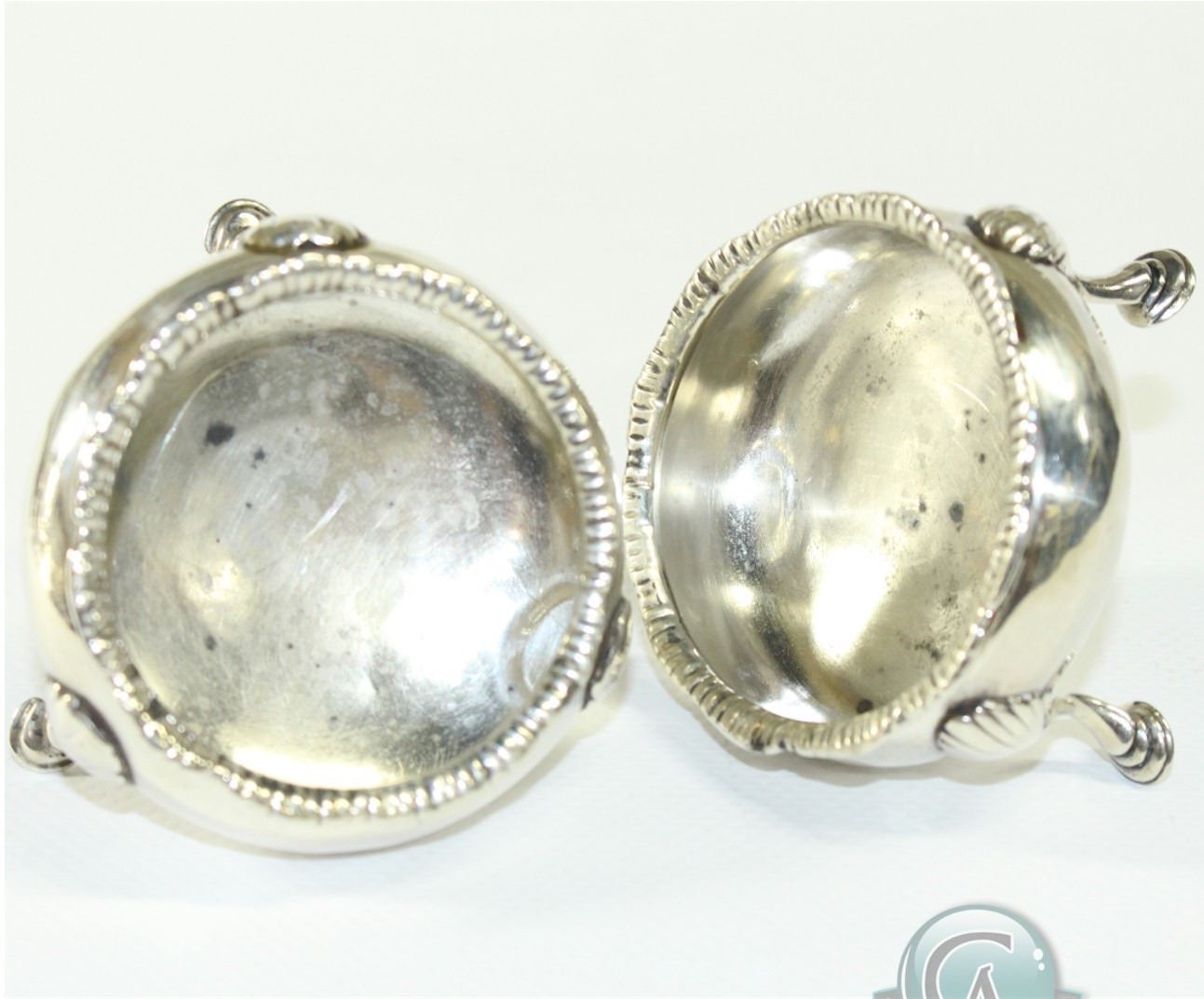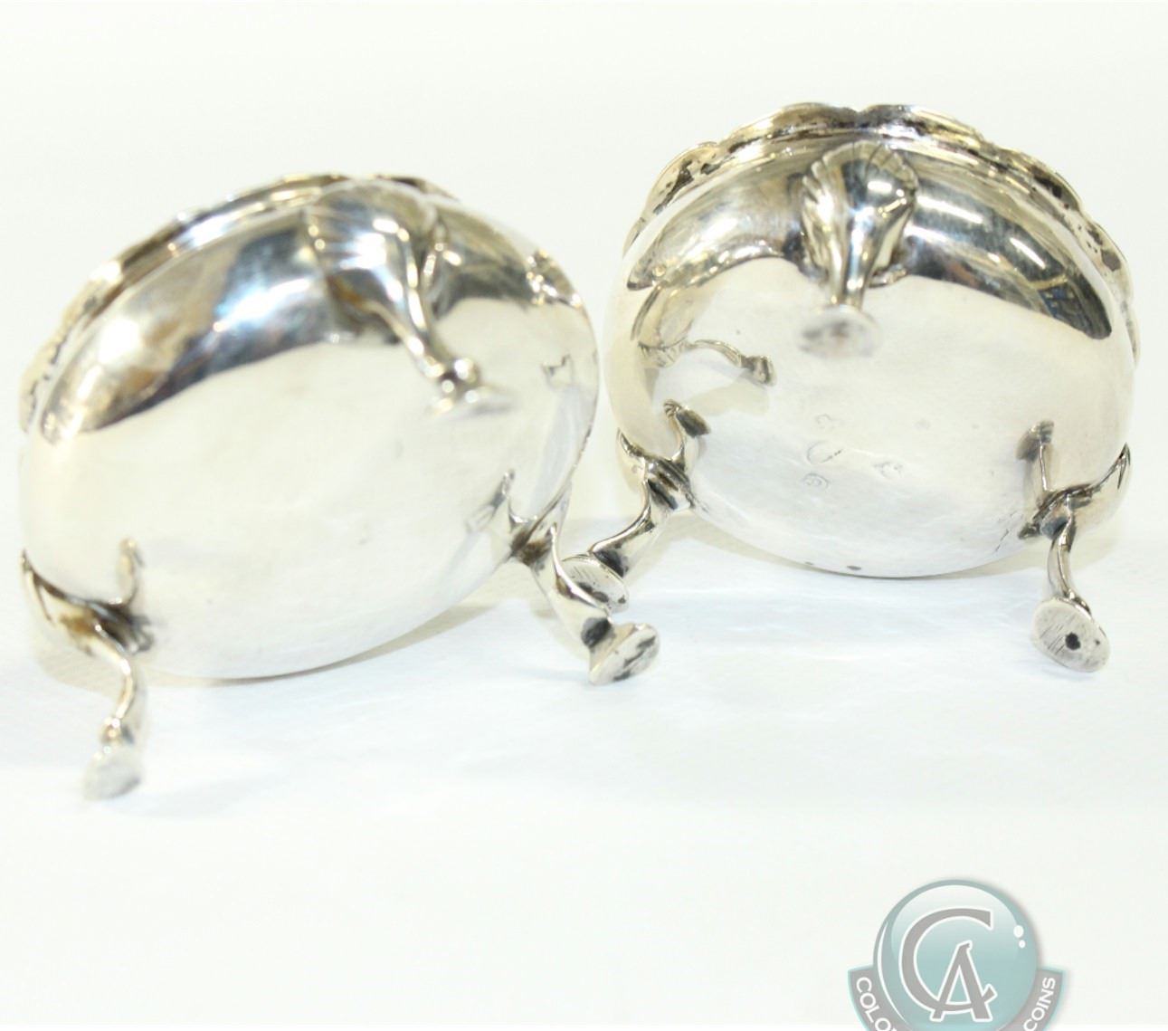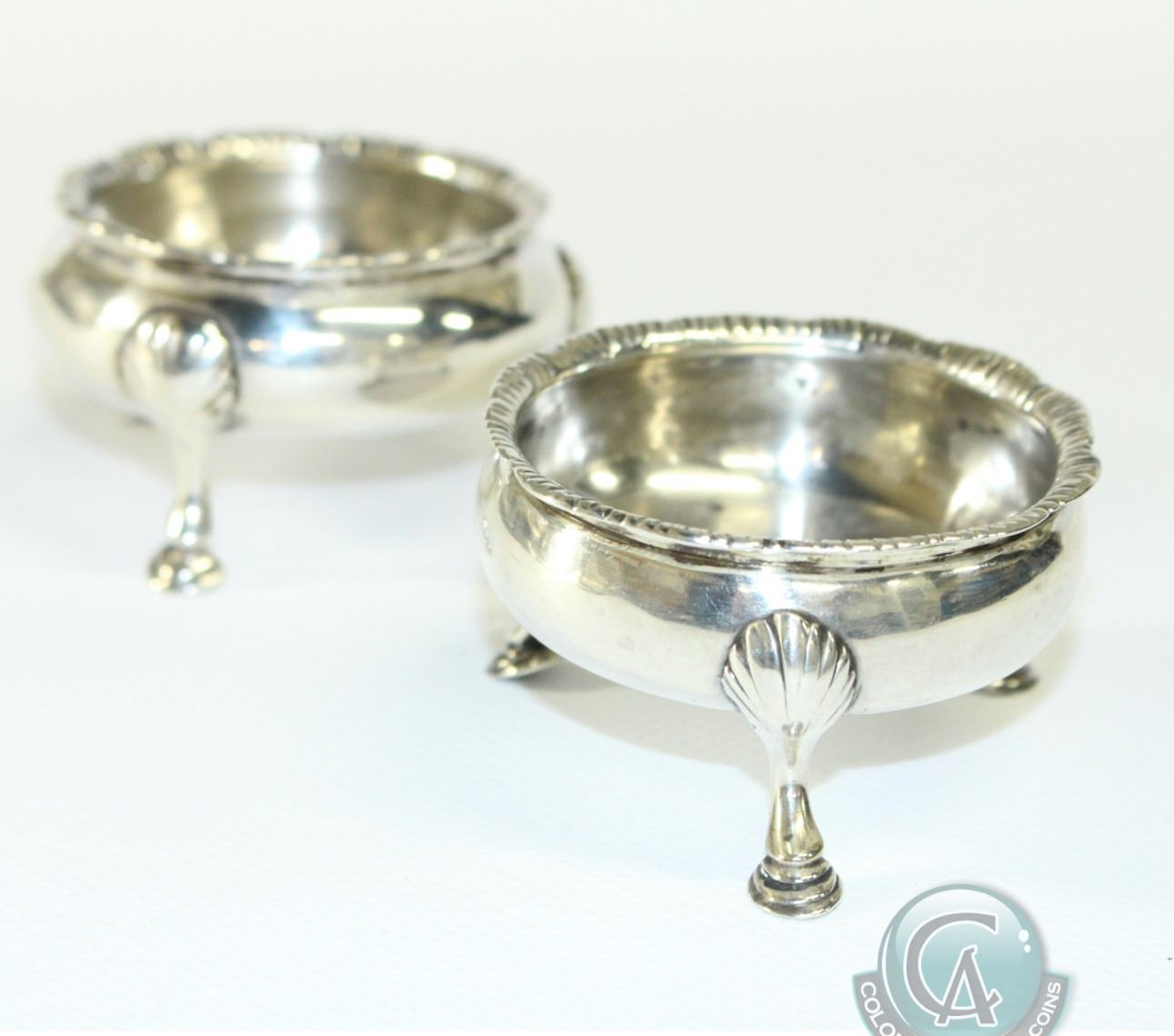 1818 London; Sterling Silver Salt Cellars. Cellars stand 1 1/2 inches in height and are 2 1/2 inches in diameter. Partial Maker Marks appear to be T.M. 2pcs.