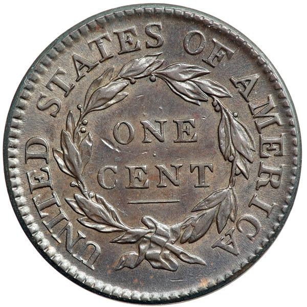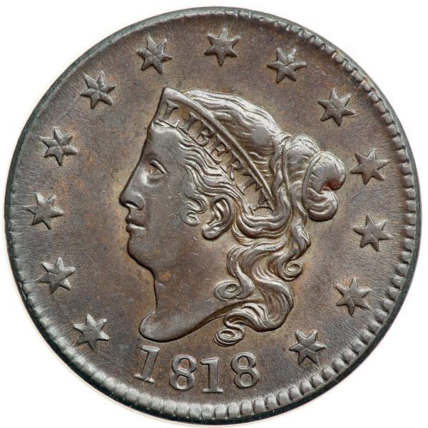 1818 N-1 R2 AU50. Glossy olive brown and chocolate with frosty lighter steel brown toning covering the protected areas. Virtually flawless, just a couple tiny ticks, including a diagonal nick left of the O in ONE. MDS. The reverse is rotated 55 degrees CCW from the normal head-to-tail die orientation.