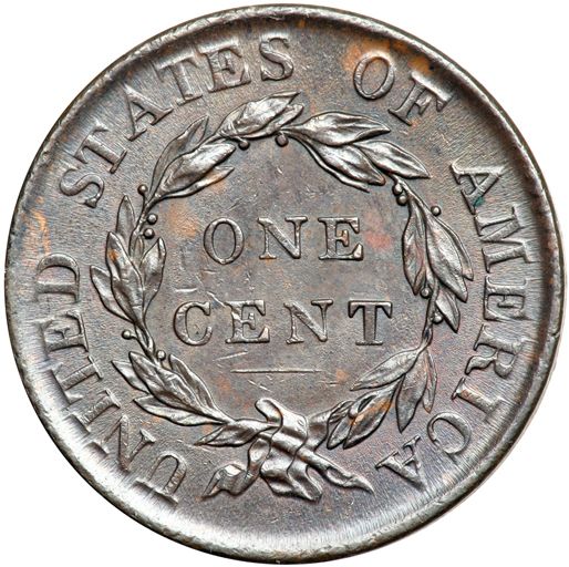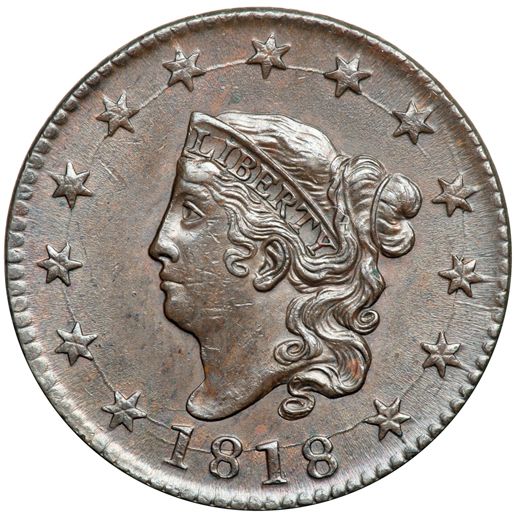 1818 N-10 R1 AU55. Lustrous bluish steel and chocolate brown with a few puffs of lighter reddish brown toning on the reverse. Nice eye appeal. A cent that never saw any circulation, but there are a few too many light ticks on the cheek for a mint state grade. M-LDS, the usual Randall Hoard die state for the variety.