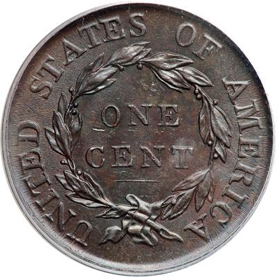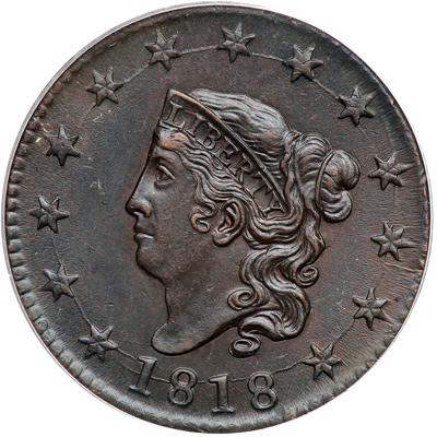 1818 N-10 R1. PCGS graded AU-58. Frosty dark bluish steel brown and chocolate with faint hints of very faded mint color showing through in a couple of the protected areas. An attractive cent with mint state eye appeal. Just a couple tiny ticks under the O in ONE and a faint hint of rub on the curl on the forehead from choice. M-LDS, the usual Randall Hoard die state for this variety. Our grade is AU58+, close to MS60.