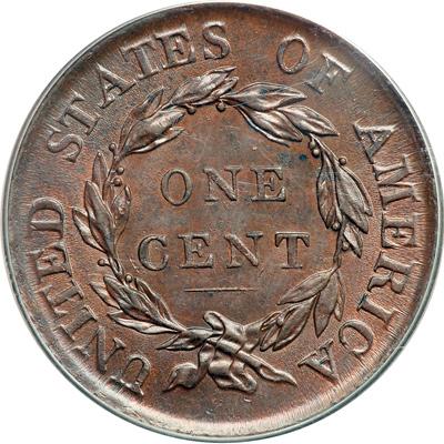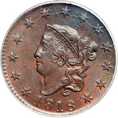 1818 N-10 R1. PCGS graded MS-62 Brown. Lustrous reddish steel and chocolate brown with darker olive brown toning at the top of the obverse. Traces of faded mint color remain on both sides. No notable marks. MDS, the usual Randall Hoard die state, with a die crack passing through the date and stars. Our grade is MS60. Comes in an old PCGS slab with a green label.