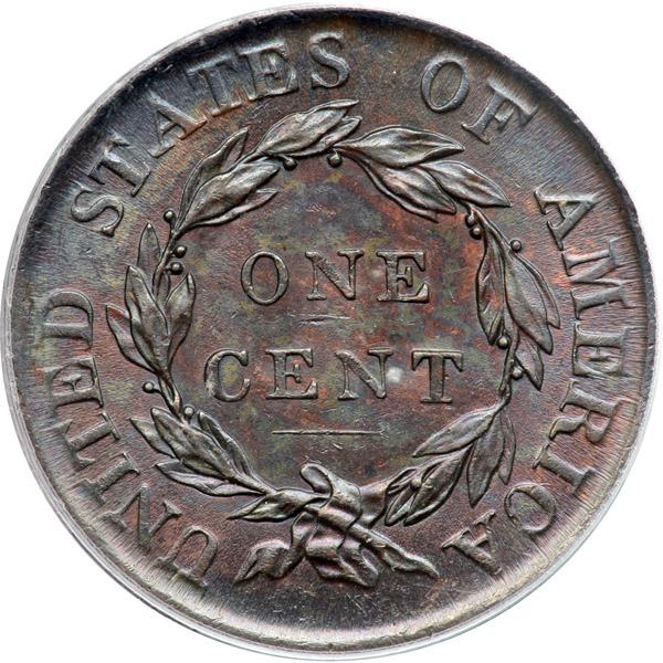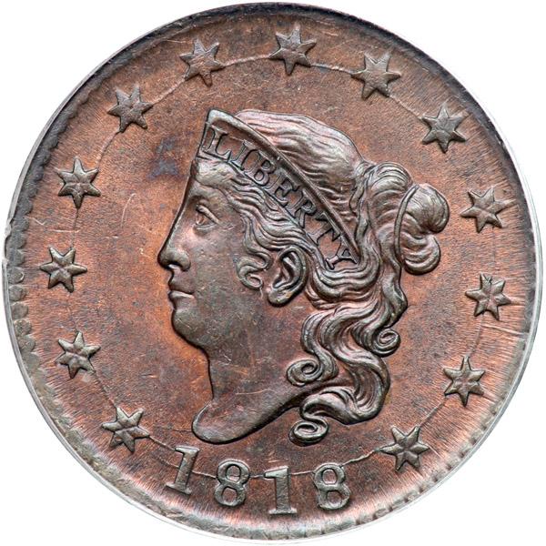 1818 N-10 R1. PCGS graded MS-63 Brown. Lustrous olive and bluish steel with very faded red bleeding through on nearly a third of the obverse and 5% of the reverse. No spots or stains, only tiny ticks on both sides from mixing with other coins. M-LDS, the usual Randall Hoard die state. Our grade is MS62, but the eye appeal is consistent with a higher grade.