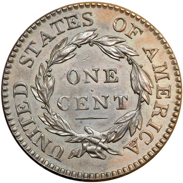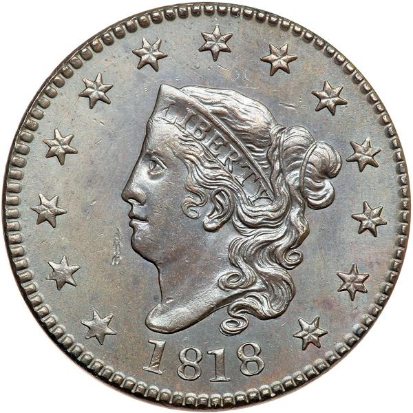 1818 N-2 R4+ AU50+. AU-50. Very close to mint state sharpness and choice except for a rather strong vertical nick in the field off the chin. Otherwise there are just a few trivial marks, including a tiny planchet chip at the bottom of the neck, a light nick in the field over the N in ONE, and a small planchet chip left of that O. Lustrous bluish steel brown and chocolate. E-MDS. In addition to the always-present fine die cracks through the top of UNITED ST and another through the bottom of STAT, there is a fine die crack joining stars 4 & 5 and a thin radial die crack from the right center of the T in UNITED to the dentils above. Sharply struck everywhere except the forelock and first 2 stars, which are a bit weak. The fields are smooth and slightly reflective offering excellent eye appeal in spite of the obverse nick. Called AU50 and tied for CC#2 in the Bland census. Noyes says AU55 net EF45 and tied for CC#3, his photo #25195. Removed from an NGC slab graded MS61BN (NGC label included). Comes with a nice provenance (plus a Newcomb collection box that apparently belongs to lot 101, not lot 100, from the Starr sale). DWH #2578.