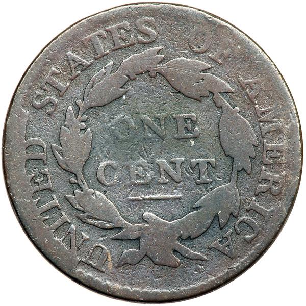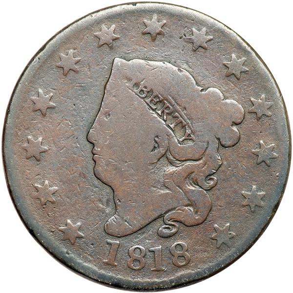 1818 N-2 R4+ G5. Good-5. Glossy chocolate and steel brown. A few trivial rim bruises and nicks consistent with the grade. There is a light dusting of very fine carbon in the center of the reverse, otherwise this cent is smooth and attractive with a strong date and full legends. LDS. The cud break over NITED extending to the right is now complete and fully raised from end to end. DWH #1880.