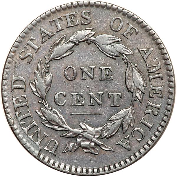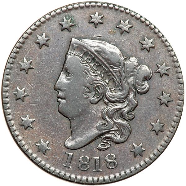 1818 N-2 R4+ VF20+. VF-20+. Glossy steel brown and chocolate with flowline frost in the protected areas, especially on the reverse. Virtually flawless except for traces of greenish verdigris dusted between the upper points of star 6 and a tiny rim bruise at the T in UNITED. Excellent eye appeal for the grade, very close to VF25. MDS with a clearly raised retained cud over NIT, and this cud is raised more on the left end than on the right. DWH #3281.
