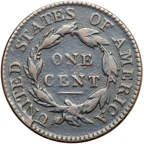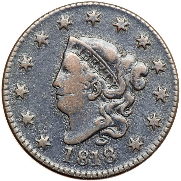 1818 N-2 R4+ VG10. VG-10. Sharper by nearly ten points with minor roughness in the fields. A thin nick right of the mouth is the only notable mark. Glossy dark steel and olive brown with lighter brown highpoints. MDS+ with a raised retained cud break over NIT, the left end over N raised so the top of the N is lost in the retained cud and the top of the I is indistinct. DWH #0445.