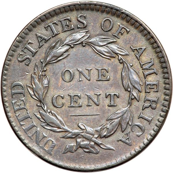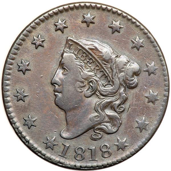 1818 N-3 R3 F15. Rotated Reverse. Fine-15. Five points sharper (even better on the reverse) but lightly burnished, now nicely retoned glossy bluish steel brown and chocolate. A thin nick in the field close to the curl behind the neck is the only mark. E-MDS. The spike up from the coronet over the L is clear, as are the tiny lumps in the field before the face, and there are clear die clashmarks around the portrait. The reverse rotated 100 degrees CCW. DWH #2373.