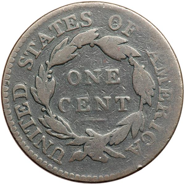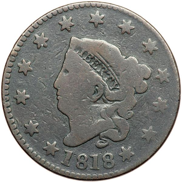 1818 N-4 R4+ G5. Good-5. Glossy olive and chocolate brown. The planchet is smooth, just a few small nicks including a light rim nick off the stem tip. Struck very slightly off center to the right leaving the details stronger on the left side, weaker on the right. Rare EDS, before any hint of swelling in the obverse fields or a radial die crack from the dentils through star 3. The O in ONE is properly struck, another indication the obverse die has not started to fail. DWH #1881.
