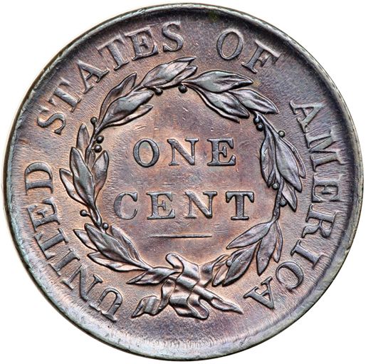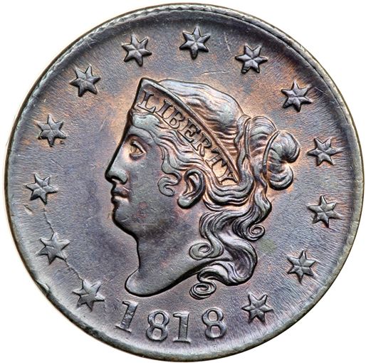 1818 N-5 R3 EF40. At least 5 points sharper but lightly cleaned and retoned frosty bluish steel and olive brown with deceptive faded "mint" red toning in some of the protected areas on both sides. The only mark is a small rim nick left of star 1. Great luster and excellent eye appeal, looks very close to mint state. LDS. The die crack at stars 1-4 extends down to the rim under star 1.