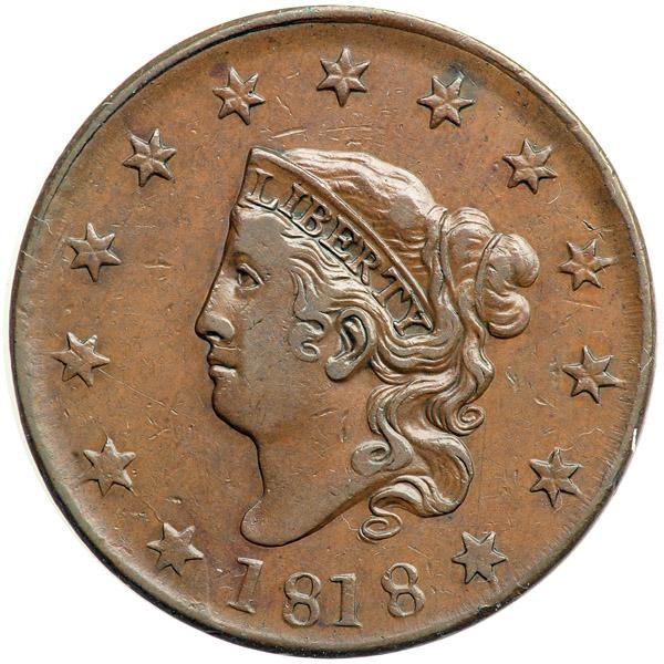 1818 N-5 R3 VF30. Slightly sharper but there are a couple rim nicks at ED in UNITED. Glossy medium brown on smooth, attractive surfaces. LDS with a clear die crack from the right point of star 1 down to the dentils left of the date.
