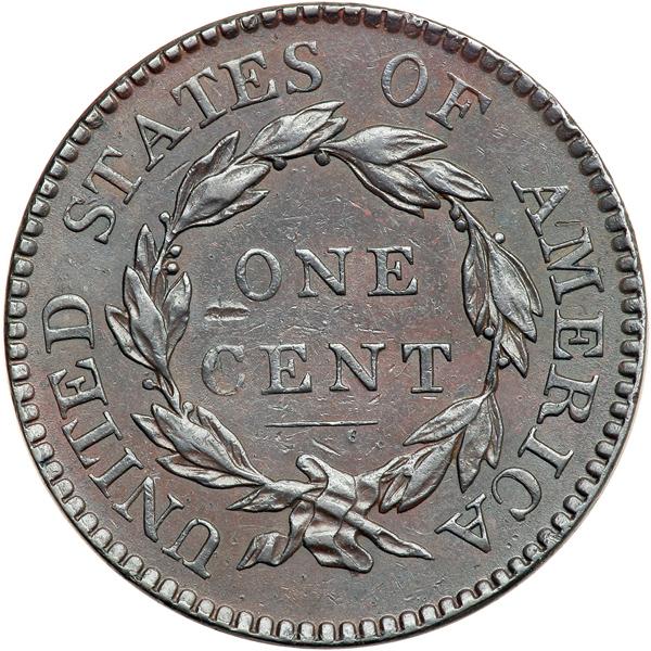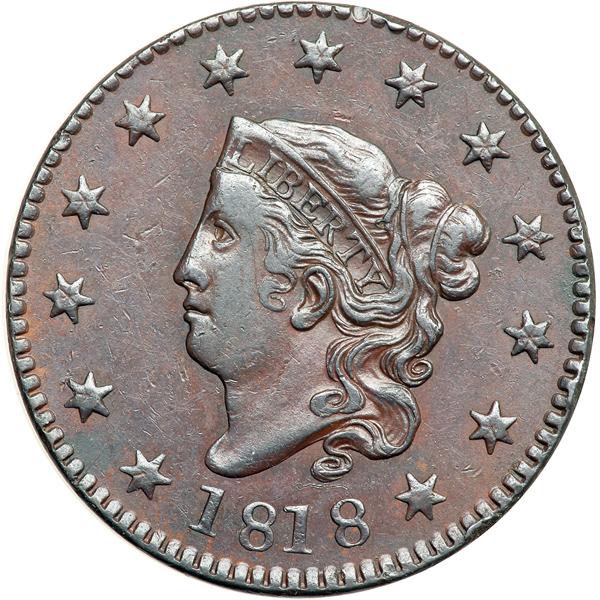 1818 N-5 R3 VF30+. VF-30+. Sharpness VF35 or slightly better with a few too many light contact marks for that sharpness grade, including rim nicks at stars 7, 11, and 13, plus a dull horizontal nick over the C in CENT. Frosty reddish steel brown and chocolate with darker steel brown toning on the highpoints. Sharply struck EDS. The die cracks at stars 1-3 and 10-12 are faint. The obverse fields are slightly reflective and the dentils are crisp around both sides. (An example with an uncracked obverse has not been confirmed and may not exist.) Removed from a PCGS slab graded EF45 (PCGS label included). DWH #3257.
