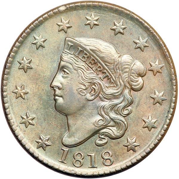1818 N-6 R1 AU55. Double Profile. AU-55. A mint state piece that was dipped or lightly cleaned and is now retoned a lustrous golden tan with subtle overtones of light bluish steel. The only marks are a dull nick in the dentils over star 6 and a small splash of reddish chocolate toning at the right foot of F in OF. M-LDS with clear vertical die lines added through ICA and the stem end. The die crack at ED-ST-F-AMERIC is clear but the rectangular lump inside the bottom of that C is now gone. Strong doubling from die bounce shows along the bottom edge of the bust, chin, nose, nostril, and ear. DWH #0460.
