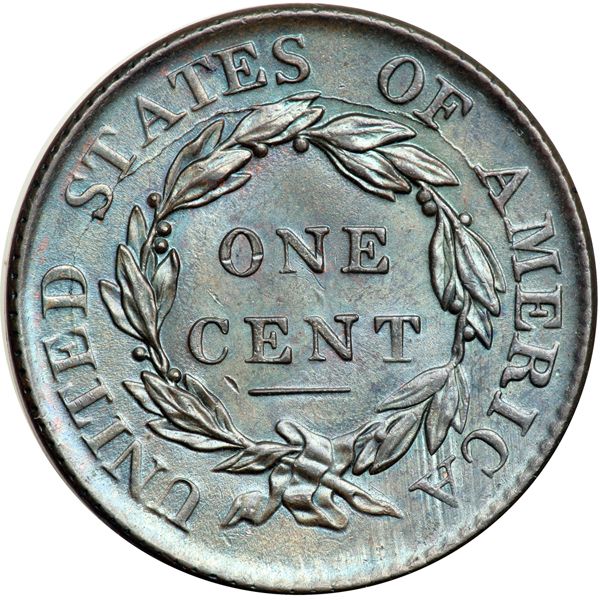 1818 N-6 R1 MS63. Very attractive and highly lustrous bluish steel brown and chocolate with 10% of the mint color remaining on the obverse. The only marks are a trio of small parallel nicks on the end of the chin and a tiny diagonal nick off the left end of the line below CENT. LDS with dull but strong parallel die lines (possibly from a lap stone applied to the die) behind ICA in AMERICA and the reverse dentils weakened or missing altogether. Doubling from die bounce shows on the tip of the nose, on the jaw near the throat, and boldly along the bottom edge of the bust. Called MS63 choice and tied for CC#1 in the Noyes census, his photo #20952. Bland says MS63 and tied for CC#1 as well. Removed from a PCGS slab graded MS64BN (PCGS label included, and it shows the attribution and Naftzger provenance).