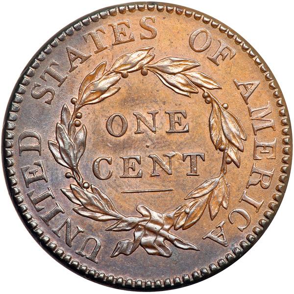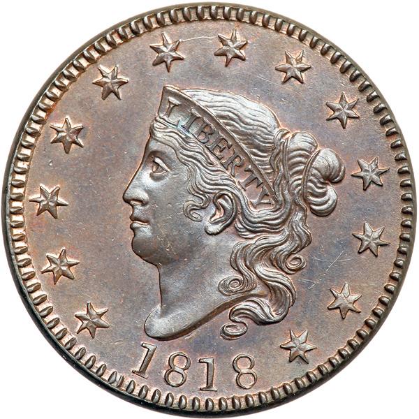 1818 N-7 R1 MS60+. Thin Date with "Twisted" Stars and Dentils. MS-60+. Very attractive lustrous dark bluish steel brown with lighter brown toning on the reverse and traces of mint red remaining on both sides. Sharply struck EDS with smooth, reflective fields, especially on the obverse. The obverse was struck with the normal N-7 die but the die apparently twisted upon impact (perhaps it was loose in the press) causing the date and stars to become distorted. The date digits are very thin and the points of the stars are bent, especially the outer points which are bent in a counterclockwise direction. The twisting also affected the dentils leaving them thinner than normal. This is an odd-looking cent, most likely one of the first few struck before the die was properly seated. One of only 4 known with the thin date, and the other 3 are in low grade. DWH #3127.