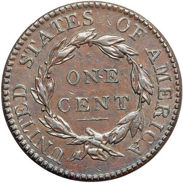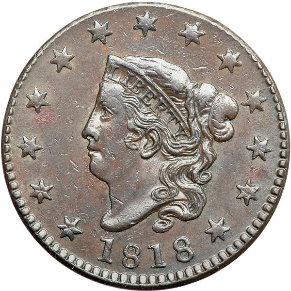 1818 N-9 R3 EF40. EF-40. Slightly sharper with a few too many light contact marks for the sharpness grade, including a faint horizontal scuff on the curl left of the ear and a small dig between the N & E in ONE. Attractive glossy chocolate and darker steel brown with frosty lighter steel brown covering the protected areas and a spot of reddish toning at the bottom of star 4. Scarce EDS with sharp dentils and smooth, slightly reflective fields. No die cracks or dentil fusing, and the repunching on the outer point of star 8 is bold. The obverse is slightly misaligned to the top while the reverse is properly centered on the planchet. DWH #0466.