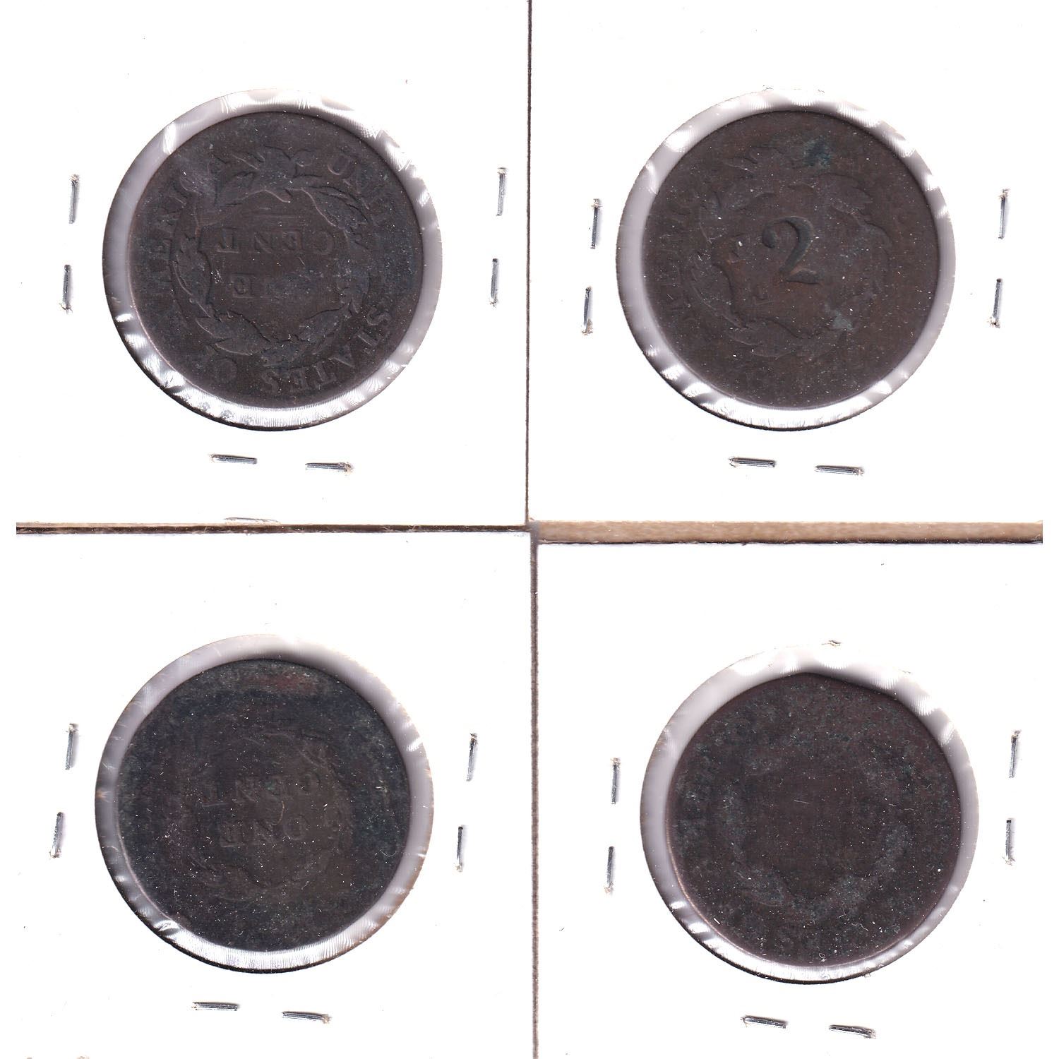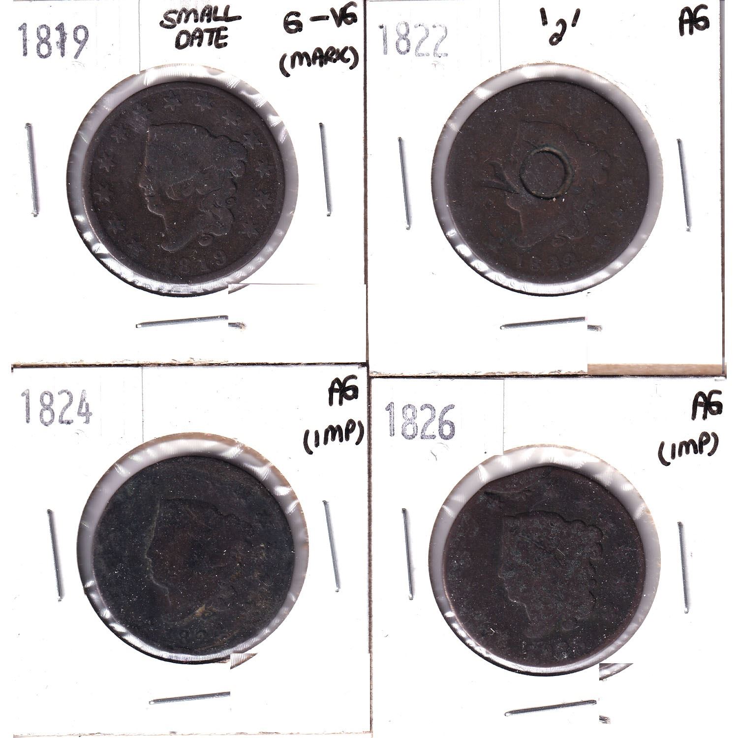 1819-1826 USA One Cent AG/G-VG Condition. Lot includes: 1819 Small Date G-VF (Marks), 1822 Counter Stamp "2" One Cent, 1824 One Cent AG (impaired) & 1826 One Cent AG (impaired)4pcs