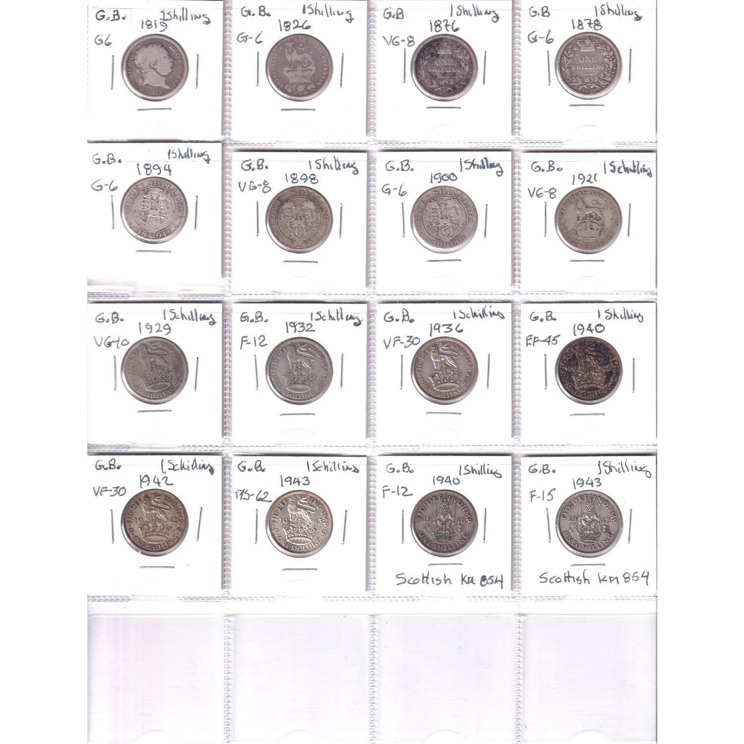 1819-1943 Great Britain 1 shilling. Coins appear to range in grade from Good to MS. Lot includes 2x Scottish shilling KM854 in F12 & F15. Please view scan for details. 16pcs