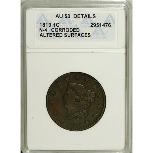 <B>1819 1C Large Date--Altered Surfaces, Corroded--ANACS. AU50 Details.</B></I> N-4. NGC Census: (5/159). PCGS Population (5/86). Mintage: 2,671,000. Numismedia Wsl. Price: $250. (#1603)<BR><BR><b>Shipping:</b> Coins & Currency (<a target="_blank" href="http://www.heritageauctions.com/common/shipping.php">view shipping information</a>)