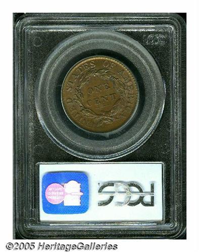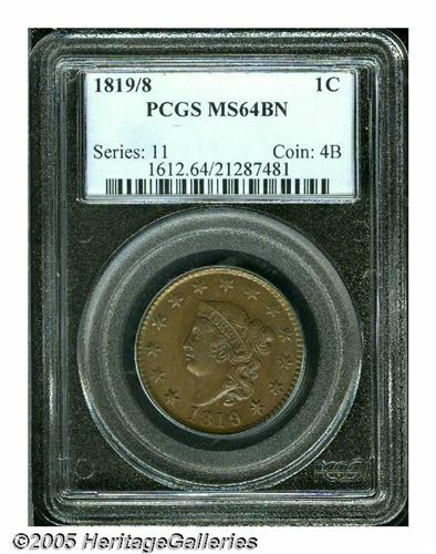 <B>1819<1C> Large Date MS64 Brown PCGS.</B></I> N-2, R.1. Misattributed by PCGS as the 1819/8 variety (N-1). A lustrous golden-brown near-Gem with unmarked surfaces and minor striking softness on the upper obverse stars. A whisper of verdigris accompanies the reverse periphery. Population: 9 in 64, 0 finer (6/05).<BR><I>From The Melrose Bay Collection.</B></I>