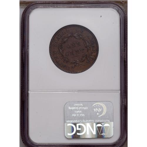 <B>1819<1C> Small Date AU53 NGC.</B></I> N-3, R.3. A golden-brown large cent that has moderate rub on the cheek and the highpoints of the hair. An unimportant and solitary pinscratch is noted in the center of the left obverse field, with another beneath the TES in STATES. EAC 35.