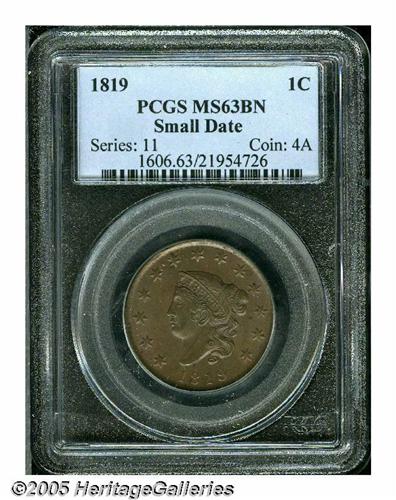 1819 1C Small Date MS63 Brown PCGS. N-9, R.1. A l
