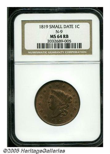1819 1C Small Date MS64 Red and Brown NGC. N-9, R