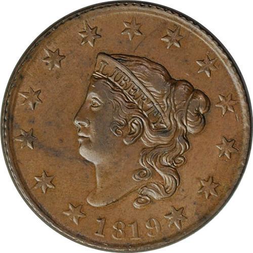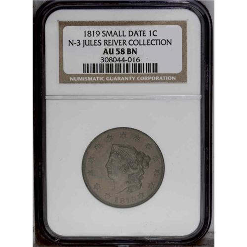 <B>1819<1C> Small Date. N-3, R.3. AU58 NGC. XF40 EAC.</B></I> A faint die crack is visible on the obverse, from the lower edge of the bust toward star 1. Lustrous light brown obverse with slightly deeper olive color on the reverse. Several faint scratches are visible inside the wreath.<BR><I>Ex: George Ramont (8/9/1977).</B></I> Envelope Included.