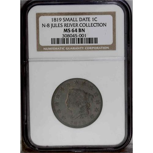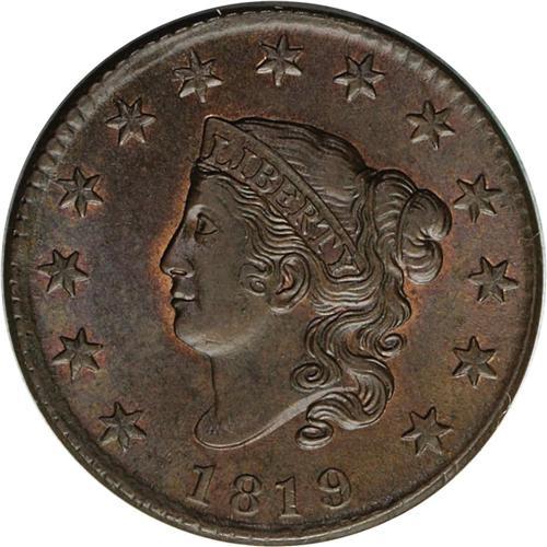 1819 1C Small Date. N-8, R.1. MS64 Brown NGC. AU55 EAC 1819[1C] Small Date. N-8, R.1. MS64 Brown NGC