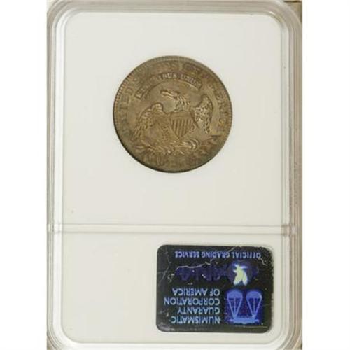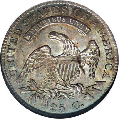<B>1819 25C Large 9 AU58 NGC.</B></I> B-2, R.3. Breen Die State IV with a crack between the 18 in the date. Apple-green and orange-gold toning cannot conceal the shimmering luster throughout the devices and margins. Liberty's chin and drapery display faint wear. Pleasing despite a minor mark near star 4. <BR><BR><b>Shipping:</b> Coins & Currency (<a target="_blank" href="http://www.heritageauctions.com/common/shipping.php">view shipping information</a>)