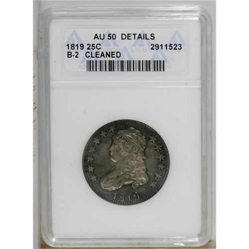 <B>1819 25C Large 9--Cleaned--ANACS. AU50 Details.</B></I> B-2, R.3. A well struck, uniformly lustrous piece with minor wear. The surfaces have largely retoned violet and gold.<BR><BR><b>Shipping:</b> Coin/Currency (<a target="_blank" href="http://www.heritageauctions.com/common/shipping.php">view shipping information</a>)