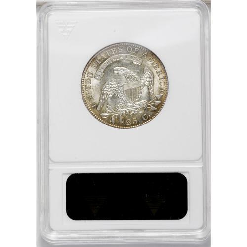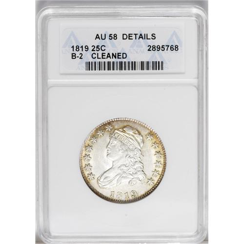 <B>1819<25C> Large 9--Cleaned--ANACS. AU58 Details.</B></I> B-2, R.3. Boldly struck with highpoint friction and subdued luster. The hairlined surfaces are gold-orange at the periphery with untoned centers.