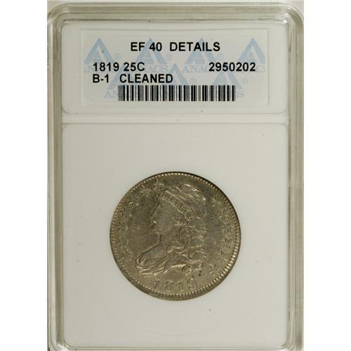 <B>1819 25C Large 9--Cleaned--ANACS. XF40 Details.</B></I> B-1, R.5. B-1 is significantly rarer than B-2, the other Large 9 Browning variety. A slightly bright but nicely detailed example with cloud-gray surfaces. A thin, subdued mark is noted beneath the beak.<BR><BR><b>Shipping:</b> Coins & Currency (<a target="_blank" href="http://www.heritageauctions.com/common/shipping.php">view shipping information</a>)
