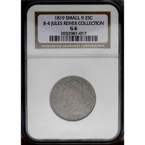<B>1819<25C> Small 9 B-4c R.4. Good 6 NGC. Die State V.</B></I> Small 9, curl over center of 9; Curve based 2, 5 doubled. The obverse now has an additional crack through the top of the date and this is one of the latest die states seen. Dark steel gray with lighter silver on the devices, with smooth, even wear and no significant surface problems. A very desirable die state.<BR><I>Ex: Paul Padget (7/1986).</B></I> Envelope Included.