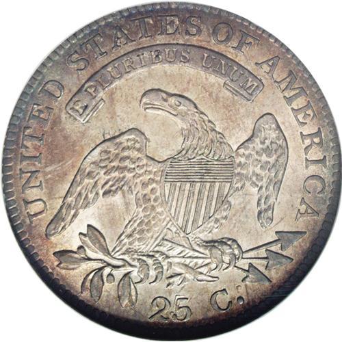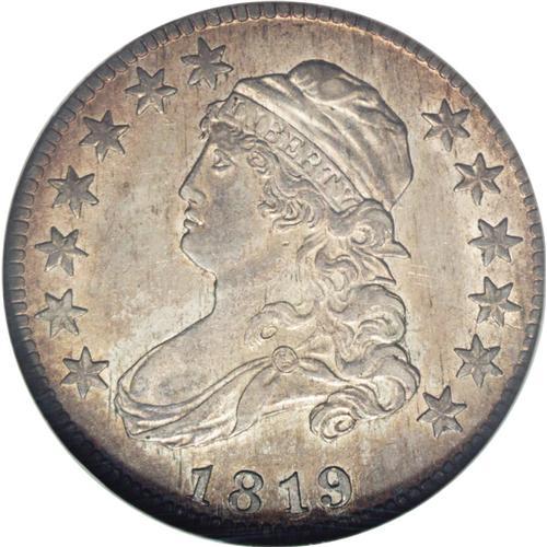 <B>1819<25C> Small 9 MS63 NGC.</B></I> B-3, R.1. Misattributed as the scarcer B-4 by NGC. Both varieties share the same reverse with a broadly recut 25, but the 9 in the date and star 8 are differently placed relative to the bust. This crisply struck example possesses bright honey-gold luster across the reverse and throughout the obverse border. Gunmetal-gray toning visits the obverse field and the cheek. Census: 8 in 63, 5 finer (2/06).<BR><I>From The Lake Highlands Collection.</B></I>