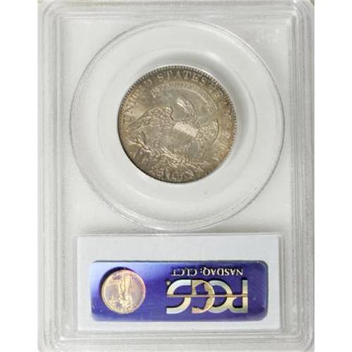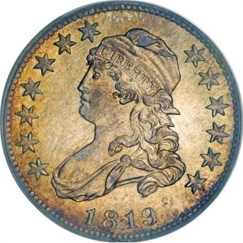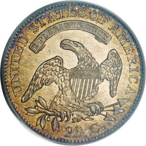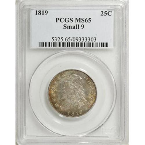 <B>1819 25C Small 9 MS65 PCGS.</B></I> B-3, R.1. The 9 in the date is mostly centered beneath Liberty's lowest hair curl. On the reverse the ED in UNITED is aligned, with the D somewhat higher. Although a common variety this piece boasts uncommon appeal, with light golden patina on both sides of the lustrous and near-pristine surfaces, deepening to lovely russet and violet at the margins. The sharp strike imparts excellent detail to the design features, and there is little to quibble about on this beautiful and appealing type coin. PCGS Small 9 Population: 4 in 65, 1 finer (12/07).<BR><BR><B>Coin Engraver:</B> John Reich<BR><BR><b>Shipping:</b> Coins & Currency (<a target="_blank" href="http://www.heritageauctions.com/common/shipping.php">view shipping information</a>)
