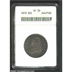1819 25C Small 9 VF30 ANACS. B-3, R.1. The die state is between I and II, with a die crack (as made) to star 11 that does not extend to the bust. The 5 in the denomination is boldly double punched. Nicely detailed for the grade, with murky lavender and russet patina. Important notice: We expect to be auctioning lots at the rate of 200-250 per hour. Sometimes eBay Premier live bid software cannot keep up with that pace, so we strongly recommend that you place a realistic proxy bid now as insurance to avoid disappointment. Also please note that all Heritage/CAA lots purchased through eBay Premier carry a 20% Buyer's Premium. Please make sure you read the Terms and Conditions.