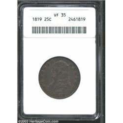 <TABLE cellSpacing=0 cellPadding=0 width="100%" bgColor=#000000 border=0><TBODY><TR><TD width="100%"><TABLE cellSpacing=1 cellPadding=3 width="100%" border=0><TBODY><TR><TD width="100%" bgColor=#79735c><FONT face=arial color=#ffffff size=3><B>Description</B> </FONT></TD></TR><TR><TD width="100%" bgColor=#ffffff><FONT face=arial size=2><B>1819 25C Small 9 VF35 ANACS.</B></I> B-4, R.6. Breen die state IV, with a die crack (as made) above the cap but none across the upper half of the date. 5 in denomination is boldly repunched. Olive and lilac patina, with attractive surfaces and pleasing definition. Accompanied by an old-time envelope with typed annotation "New Netherlands 5-55" and a cotton-lined envelope from Richard Picker. </FONT></TD></TR></TBODY></TABLE></TD></TR></TBODY></TABLE><BR><A name=PricesRealized></A><TABLE cellSpacing=0 cellPadding=0 width="100%" bgColor=#000000 border=0><TBODY><TR><TD width="100%"><TABLE cellSpacing=1 cellPadding=3 width="100%" border=0><TBODY><TR><TD width="100%" bgColor=#79735c><A name=PR><FONT face=arial color=#ffffff size=3><B>Previous Prices from Heritage Auctions</B> </FONT></A></TD></TR><TR><TD bgColor=#f6f6ed>No Prior Data Recorded </TD></TR><TR><TD bgColor=#ffffff><FONT face=arial size=1 ?>PLEASE NOTE: All prices realized reflect the final hammer price PLUS the buyer's premium in auctions that charge a buyer's premium. Each item has a notation at the top of the listing indicating whether that lot included a buyer's premium. Example: A item that sells with a final hammer price of $100 and a 20% buyer's premium will display with a price realized of $120. All information listed is intended to be as accurate as possible, but errors are possible. Please use this guide carefully and inform us of any inaccuracies. </FONT></TD></TR></TBODY></TABLE></TD></TR></TBODY></TABLE><BR><TABLE cellSpacing=0 cellPadding=0 width="100%" bgColor=#000000 border=0><TBODY><TR><TD width="100%"><TABLE cellSpacing=1 cellPadding=3 width="100%" border=0><TBODY><TR><TD width="100%" bgColor=#79735c colSpan=6><FONT face=arial color=#ffffff size=3><B>Price Guide*</B> </FONT></TD></TR><TR bgColor=#f6f6ed><TD align=middle><B>Grade</B> </TD><TD align=middle><B>Coin World<BR>(Trends)</B> </TD><TD align=middle><B>Numismedia<BR>Retail</B> </TD><TD align=middle><B>Numismedia<BR>Wholesale</B> </TD><TD align=middle><B>Coin<BR>Universe</B> </TD><TD align=middle><B>Heritage<BR>Value Index</B> </TD></TR><TR bgColor=#ffffff><TD align=middle>30</TD><TD align=right>---</TD><TD align=right>---</TD><TD align=right>---</TD><TD align=right>---</TD><TD align=right>$364.25</TD></TR><TR style="FONT-WEIGHT: bold" bgColor=#cccfdd><TD align=middle>35</TD><TD align=right>---</TD><TD align=right>---</TD><TD align=right>---</TD><TD align=right>---</TD><TD align=right>$455.63</TD></TR><TR bgColor=#ffffff><TD align=middle>40</TD><TD align=right>---</TD><TD align=right>$820.00</TD><TD align=right>$685.00</TD><TD align=right>$650.00</TD><TD align=right>$547.00</TD></TR><TR bgColor=#ffffff><TD colSpan=6><FONT size=1>*All information listed is intended to be as accurate as possible, but errors are possible. No item may be returned or refused based on this information which is provided as a service to our customers. You should contact each pricing source directly to determine the accuracy of this information. </FONT></TD></TR></TBODY></TABLE></TD></TR></TBODY></TABLE><BR><TABLE cellSpacing=0 cellPadding=0 width="100%" bgColor=#000000 border=0><TBODY><TR><TD width="100%"><TABLE cellSpacing=1 cellPadding=3 width="100%" border=0><TBODY><TR><TD width="100%" bgColor=#79735c><FONT face=arial color=#ffffff size=3><B>Population Guide</B> </FONT></TD></TR><TR bgColor=#ffffff><TD align=middle><!-- Begin Output of Population Grid--><TABLE cellSpacing=0 cellPadding=0 width="100%" border=0><TBODY><TR><TD vAlign=center><TABLE cellSpacing=0 width="100%" border=1 cellsadding="3"><TBODY><TR><TD vAlign=center><TABLE cellSpacing=0 cellPadding=3 width="100%" border=1><TBODY><TR><TD vAlign=center align=middle bgColor=#f0f1e8 colSpan=2 <CENTER><FONT face=Arial size=2><B>PCGS Pop </B></FONT><CENTER></CENTER></TD><TD vAlign=center align=middle bgColor=#f0f1e8 colSpan=2><CENTER><FONT face=Arial size=2><B>NGC Pop</B></CENTER></FONT></TD></TR><TR><TD vAlign=center><FONT face=Arial size=2>(35)</FONT> </TD><TD vAlign=center align=right><FONT face=Arial size=2>2</FONT> </TD><TD vAlign=center><FONT face=Arial size=2>(35)</FONT> </TD><TD vAlign=center align=right><FONT face=Arial size=2>3</FONT> </TD></TR><TR><TD vAlign=center><FONT face=Arial size=2>(>35)</FONT> </TD><TD vAlign=center align=right><FONT face=Arial size=2>45</FONT> </TD><TD vAlign=center><FONT face=Arial size=2>(>35)</FONT> </TD><TD vAlign=center align=right><FONT face=Arial size=2>56</FONT> </TD></TR></TBODY></TABLE></TD></TR></TBODY></TABLE></TD></TR></TBODY></TABLE><!-- End Output of Population Grid--> Important notice: Heritage usually auctions material at the rate of 200-250 lots per hour. On some occasions eBay Live bid software or the Internet may not be able to keep up with the pace of the auction. We recommend placing a realistic absentee bid now as insurance to avoid disappointment. Occasionally the auctioneer may eliminate or reject an eBay Live bid, and the auctioneer may also reopen a lot after the close of the eBay live bidding (usually because we missed an audience bid), and may reject your bid even if it shows you as the winning bidder. By bidding via eBay Live, you agree that Heritage may award the lot to another bidder at its sole discretion under the circumstances described above or any other reasonable circumstances. Also please note that all Heritage lots purchased through eBay Live carry a 20% Buyer's Premium. Please make sure you read the Terms and Conditions before you bid.</TD></TR></TBODY></TABLE></TD></TR></TBODY></TABLE>