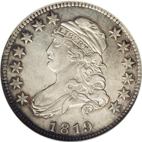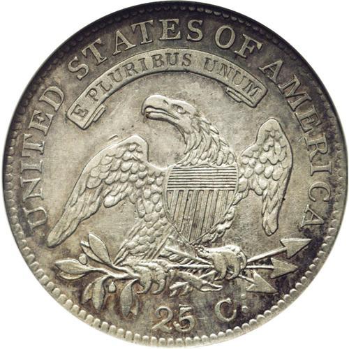 <B>1819<25C> Small 9 XF45 NGC.</B></I> B-3, R.1. Die State c in Jules Reiver's scheme or Die State IV according to Walter Breen. This example is clearly finer than the Reiver coin. Pewter-gray surfaces retain traces of luster with splashes of peripheral gold and blue toning. An attractive example despite a few faint hairlines and slight abrasions.