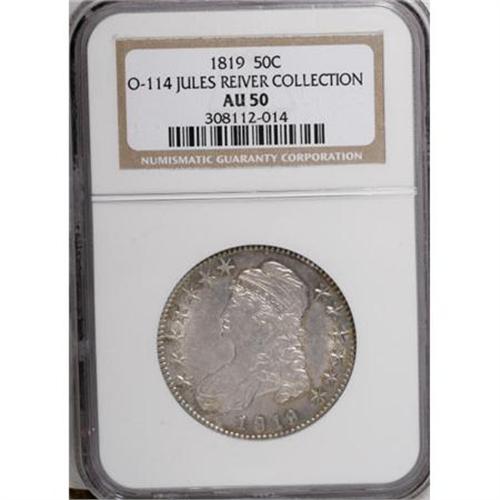 <B>1819 50C AU50 NGC.</B></I> O-114. Ex: Jules Reiver Collection. NGC Census: (21/185). PCGS Population (32/136). Mintage: 2,208,000. Numismedia Wsl. Price for NGC/PCGS coin in AU50: $304. (#6117)<BR><BR><B>Coin Engraver:</B> John Reich<BR><BR><b>Shipping:</b> Coins & Currency (<a target="_blank" href="http://www.heritageauctions.com/common/shipping.php">view shipping information</a>)