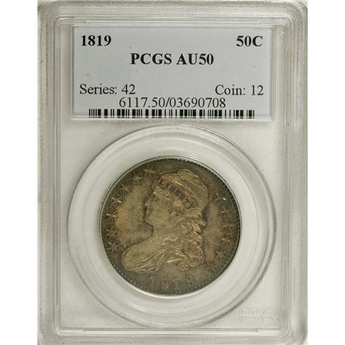<B>1819 50C AU50 PCGS.</B></I> PCGS Population (30/130). NGC Census: (42/362). Mintage: 2,208,000. Numismedia Wsl. Price for NGC/PCGS coin in AU50: $304. (#6117)<BR><BR><b>Shipping:</b> Coins & Currency (<a target="_blank" href="http://www.heritageauctions.com/common/shipping.php">view shipping information</a>)