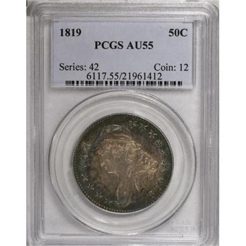 <B>1819 50C AU55 PCGS. </B></I>Population: 34 in 55, 81 finer (1/08). Census: 39 in 55, 129 finer (1/08).<BR><BR><B>Coin Engraver:</B> John Reich<BR><BR><b>Shipping:</b> Coins & Currency (<a target="_blank" href="http://www.heritageauctions.com/common/shipping.php">view shipping information</a>)