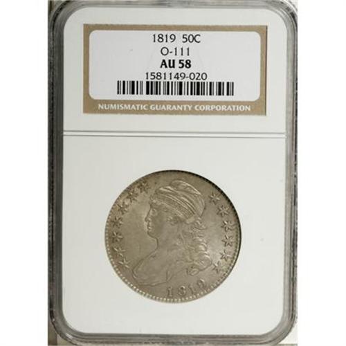 <B>1819 50C AU58 NGC.</B></I> O-111, R.2. A satiny steel-gray Borderline Uncirculated Bust half. Smooth overall, with unimportant contact beneath Liberty's eye and the left scroll end. Liberty's profile is strike doubled.<BR><BR><B>Coin Engraver:</B> John Reich<BR><BR><b>Shipping:</b> Coins & Currency (<a target="_blank" href="http://www.heritageauctions.com/common/shipping.php">view shipping information</a>)