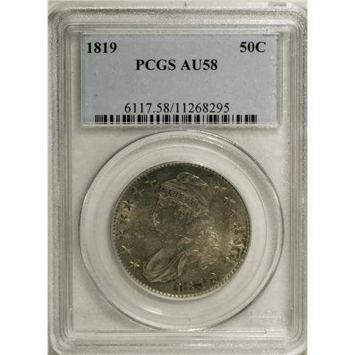 <B>1819 50C AU58 PCGS.</B></I> O-112, R.3. Luster resides in the recesses of this light gray specimen. The design elements are sharply impressed throughout.<BR><BR><b>Shipping:</b> Coins & Currency (<a target="_blank" href="http://www.heritageauctions.com/common/shipping.php">view shipping information</a>)