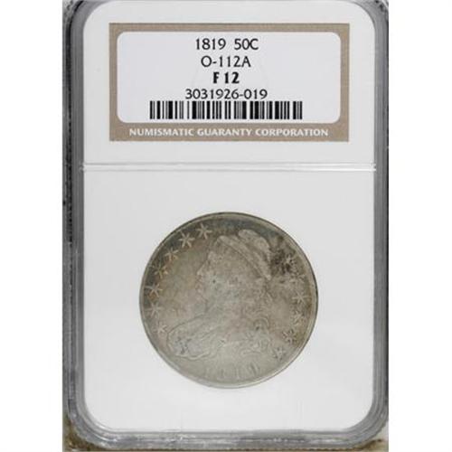 <B>1819 50C F12 NGC.</B></I> O-112A. NGC Census: (3/268). PCGS Population (3/234). Mintage: 2,208,000. Numismedia Wsl. Price for NGC/PCGS coin in F12: $41. (#6117)<BR><BR><B>Coin Engraver:</B> John Reich<BR><BR><b>Shipping:</b> Coins & Currency (<a target="_blank" href="http://www.heritageauctions.com/common/shipping.php">view shipping information</a>)