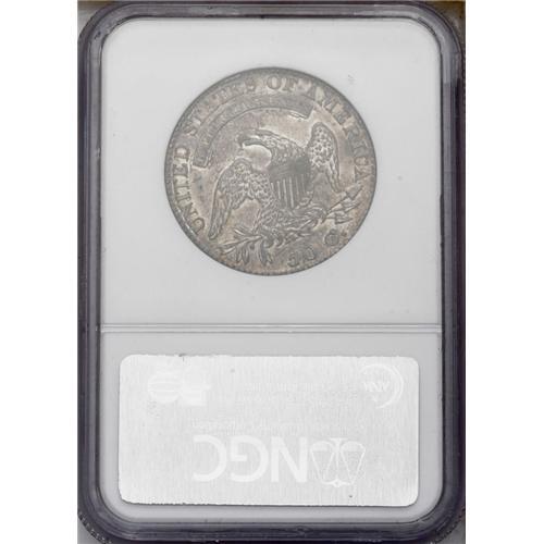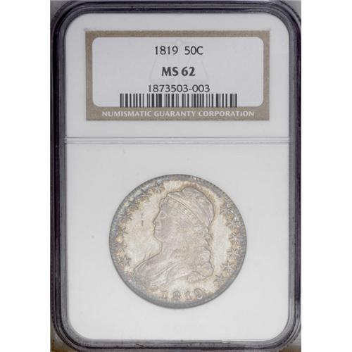 <B>1819<50C> MS62 NGC.</B></I> O-109, R.2. Attractive golden-brown, powder-blue, and cream-gray toning drapes this lustrous and nicely struck Bust half. A few faint obverse slide marks are all that limit the grade. <BR><BR><B>Important notice:</B> Heritage usually auctions material at the rate of 200-250 lots per hour. On some occasions eBay Live bid software or the Internet may not be able to keep up with the pace of the auction. We recommend placing a realistic absentee bid now as insurance to avoid disappointment. Occasionally the auctioneer may eliminate or reject an eBay Live bid, and the auctioneer may also reopen a lot after the close of the eBay live bidding (usually because we missed an audience bid), and may reject your bid even if it shows you as the winning bidder. By bidding via eBay Live, you agree that Heritage may award the lot to another bidder at its sole discretion under the circumstances described above or any other reasonable circumstances. Since eBay bids are not shown to us until we open the lot on the floor, we treat those bids just like floor bids. In most cases the floor responds before the eBay bid is presented to us, due to Internet lag time, so for consistency we have made it a policy that floor bids are always considered first over tie eBay live bids. Also please note that all Heritage lots purchased through eBay Live carry a 20% Buyer's Premium. Please make sure you read the Terms and Conditions before you bid. This lot is being auctioned in conjunction with a live floor auction by Heritage Galleries & Auctioneers. All final auction and invoice information will be supplied by Heritage Galleries & Auctioneers, and all other information should be considered preliminary. Lot:1944 <BR><BR><B>Winning Notification and Billing:</B> After the FINAL session in this auction is complete, Heritage will send e-mail and snail mail invoices. This process normally takes several days. All final auction and invoice information will be supplied by Heritage Galleries & Auctioneers, and all other information should be considered preliminary. <BR><BR>This auction will be conducted on a live auction floor and over the Internet through eBay Live. If you choose to place an absentee bid, please take a moment to <font color='#0000ff'><u><a href='http://pages.ebay.com/liveauctions/help/before/laabsentee.html'>learn how eBay Live absentee bidding works</a></u></font><font color='#000000'>
