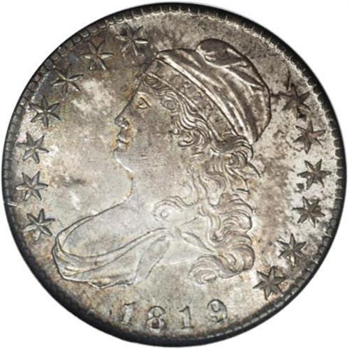 <B>1819 50C MS63 NGC.</B></I> O-112, R.3. Splashes of apple-green and golden-brown toning blanket this glossy and shimmering half dollar. The strike is assertive, and the only indication of contact is found on Liberty's jaw. A challenging date in Select Mint State. The single finest among five pieces certified by NGC as either O-112 or O-112a.<BR><I>From The Westmoreland, Virginia Collection.</B></I>