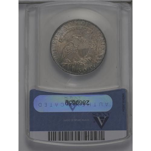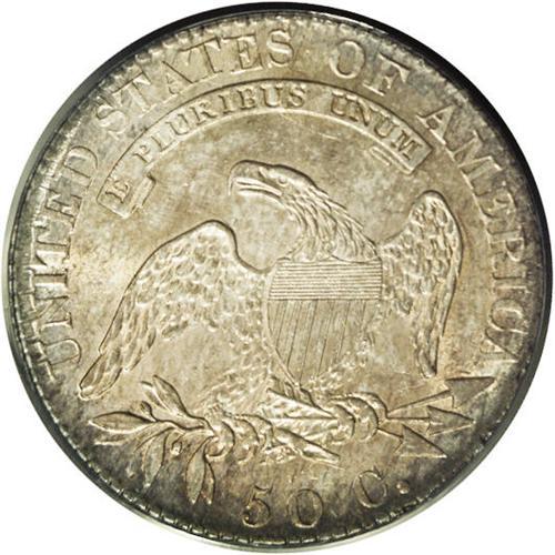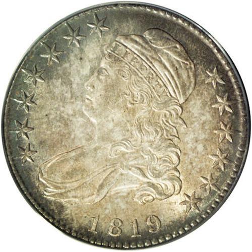 <B>1819<50C> MS64 ANACS.</B></I> O-111, R.2. The reverse die of this variety is quickly recognized by the stair-step appearance of the word STATES. ST are high, AT lower and leaning left, and ES even lower at the base. This example is a satiny near-Gem with lovely gold and iridescent toning.