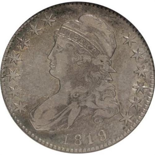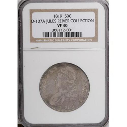 <B>1819 50C VF30 NGC.</B></I> O-107A. Ex: Jules Reiver Collection. NGC Census: (7/250). PCGS Population (6/219). Mintage: 2,208,000. Numismedia Wsl. Price for NGC/PCGS coin in VF30: $80. (#6117)<BR><BR><B>Coin Engraver:</B> John Reich<BR><BR><b>Shipping:</b> Coins & Currency (<a target="_blank" href="http://www.heritageauctions.com/common/shipping.php">view shipping information</a>)