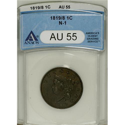 <B>1819/8 1C AU55 ANACS.</B></I> N-1. NGC Census: (2/51). PCGS Population (12/28). Mintage: 2,671,000. Numismedia Wsl. Price for NGC/PCGS coin in AU55: $410. (#1612)<BR><BR><b>Shipping:</b> Coins & Currency (<a target="_blank" href="http://www.heritageauctions.com/common/shipping.php">view shipping information</a>)